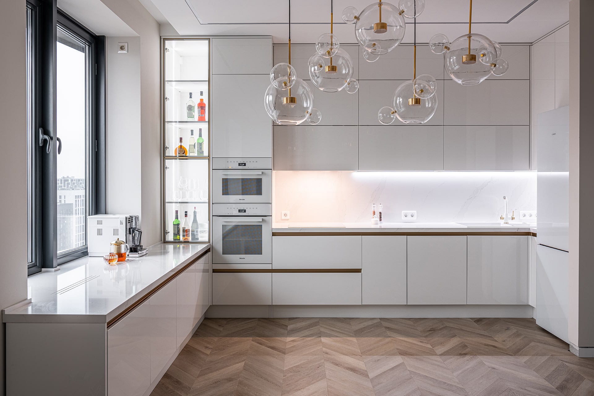 Освещение является неотъемлемой частью любого интерьера, которое завершает образ, подчеркивая детали и создавая комфортное для глаз пространство. Интерьер кухни в белых тонах довольно требователен к свету: грамотное освещение преобразит гарнитур, создавая интересные блики и оттеняя линии.