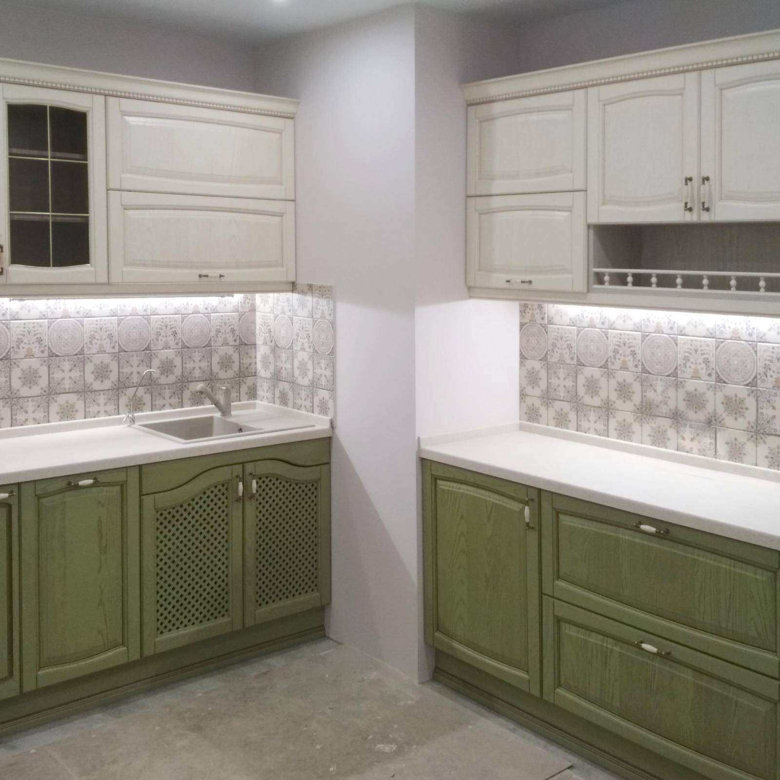 Фартук. Для оливковой кухни он может быть как однотонным, так и ярким, с обилием декора. Если оформление стен в рабочей зоне будет контрастным, в интерьере кухни обязательно нужно предусмотреть детали, которые по своему оттенку будут поддерживать этот элемент отделки. Хорошо выглядит в отделке фартука плитка с изображением веток оливы, со средиземноморскими фермерскими мотивами. Разбавить однообразие однотонной плитки может затирка контрастного оттенка между швами.