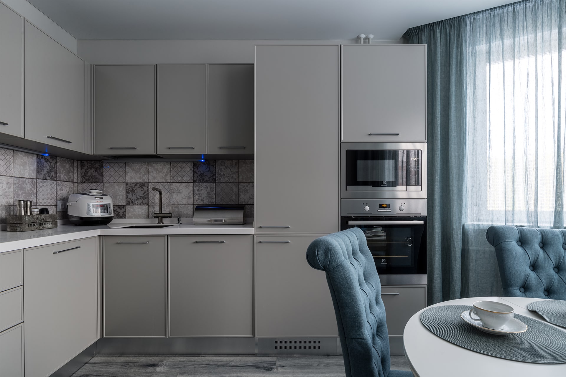 • недостаток света способен сделать серую кухню тусклой. Чтобы этого избежать, рекомендуется использовать светодиодное освещение, а также не пренебрегать дополнительной подсветкой в рабочей зоне;